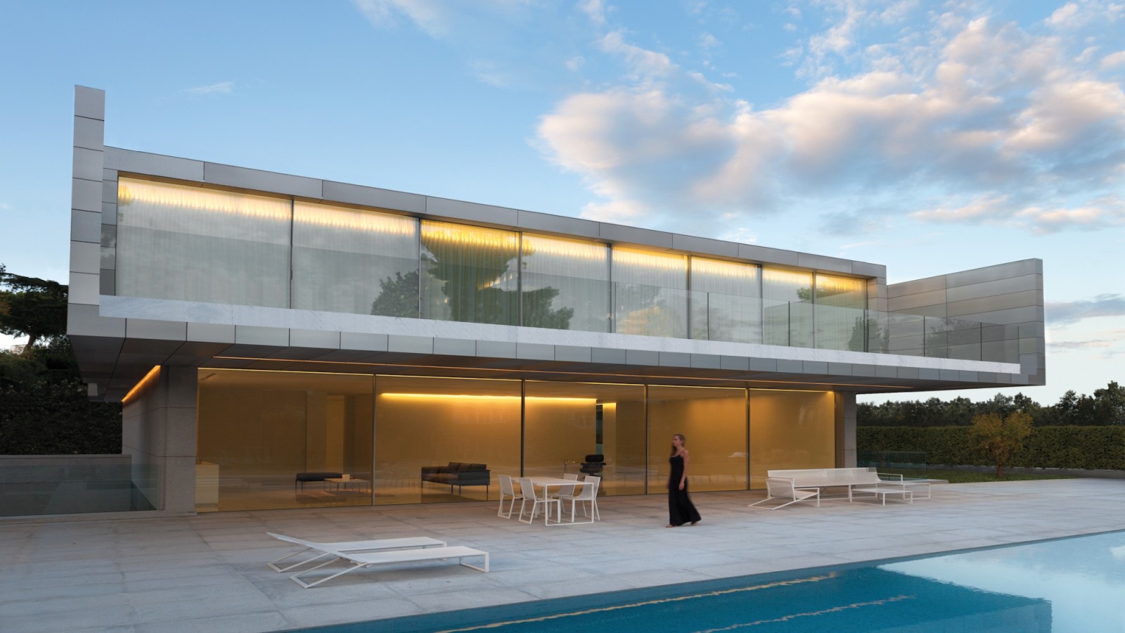 El trabajo de Fran Silvestre está influenciado por su mentor Álvaro Siza Vieira y por Andreu Alfaro, artista famoso por sus esculturas de metal. En el caso de la Casa de Aluminio, el mismo nombre alude a su vínculo “material“. Una de las características más destacadas de la villa de Madrid es la hábil orquestación de los efectos de iluminación, gracias a la disposición de las habitaciones alrededor de una escalera central, inundada de luz. Esta característica de su diseño hace que el área del baño también se beneficie de la luz natural
